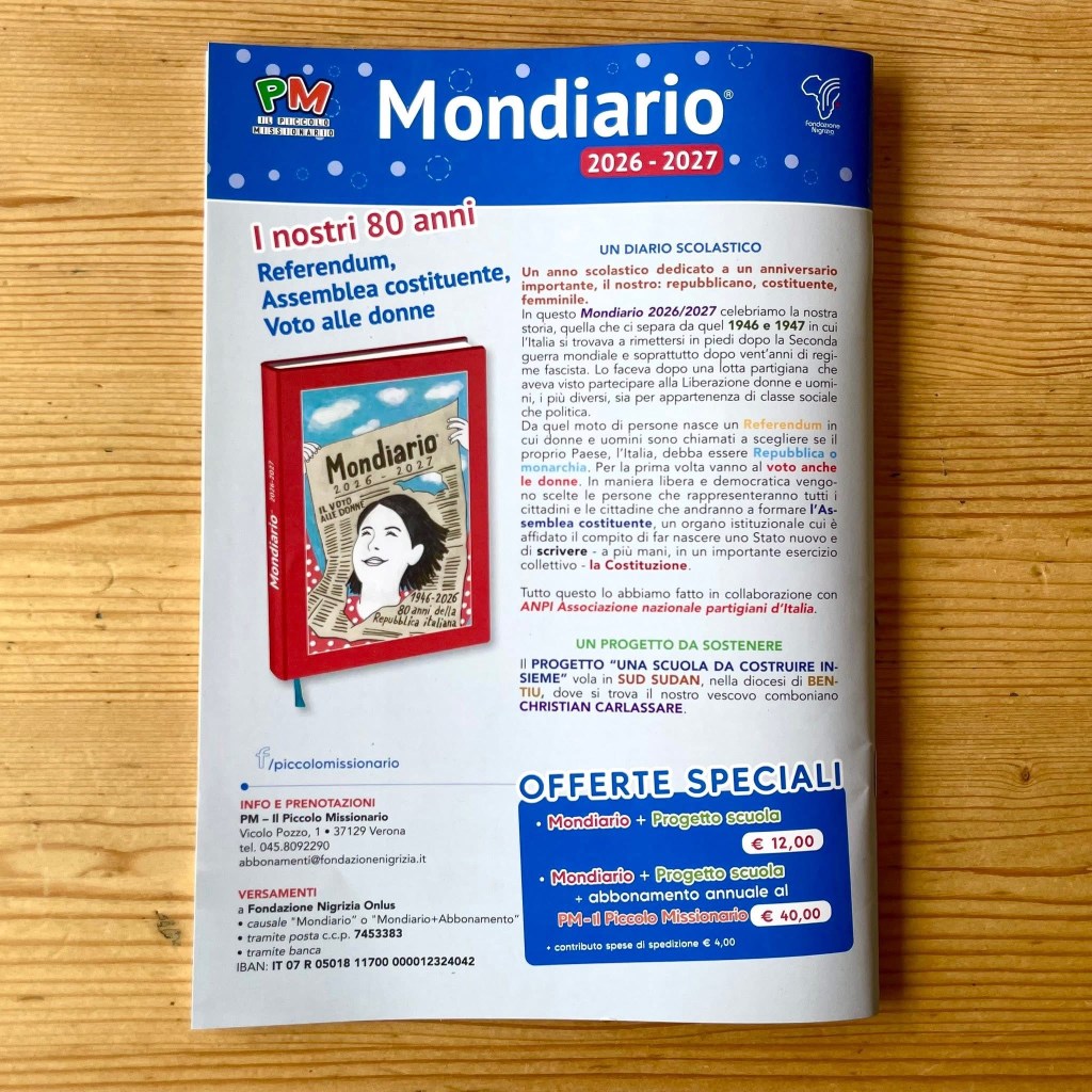 Il PM-Il Piccolo Missionario dedica la copertina al MONDIARIO 2026-27 (quello del prossimo anno scolastico) da me illustrato, fresco di stampa da qualche giorno. È dedicato ad alcuni compleanni importanti di noi tutti: festeggiamo infatti gli 80 anni del referendum monarchia-repubblica, del voto alle donne e della formazione dell’assemblea costituente.